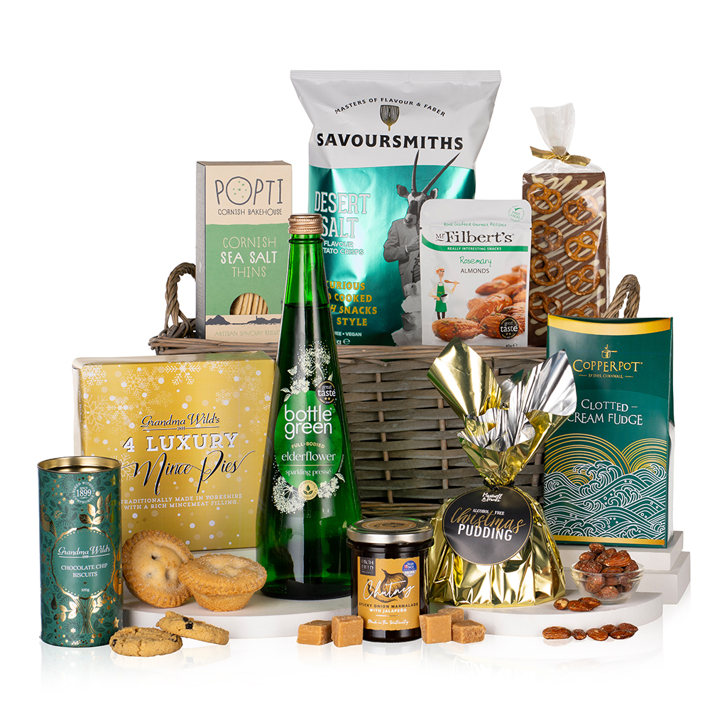 A joyful alcohol-free gift full of sweet and savoury favourites, including Joe & Seph’s Pistachio Popcorn, Olly’s Multi-Seed Sesame Pretzel Thins, Savoursmiths Cheddar & Shallot Crisps, Ooh! Chocolata Honeycomb Bar, Reids Oat Crumbles, ViP Nuts Hot Honey & Mustard, Lemon Loaf Cake and Heartsease Farm Sparkling Lemonade. A refreshing, inclusive treat for any occasion.